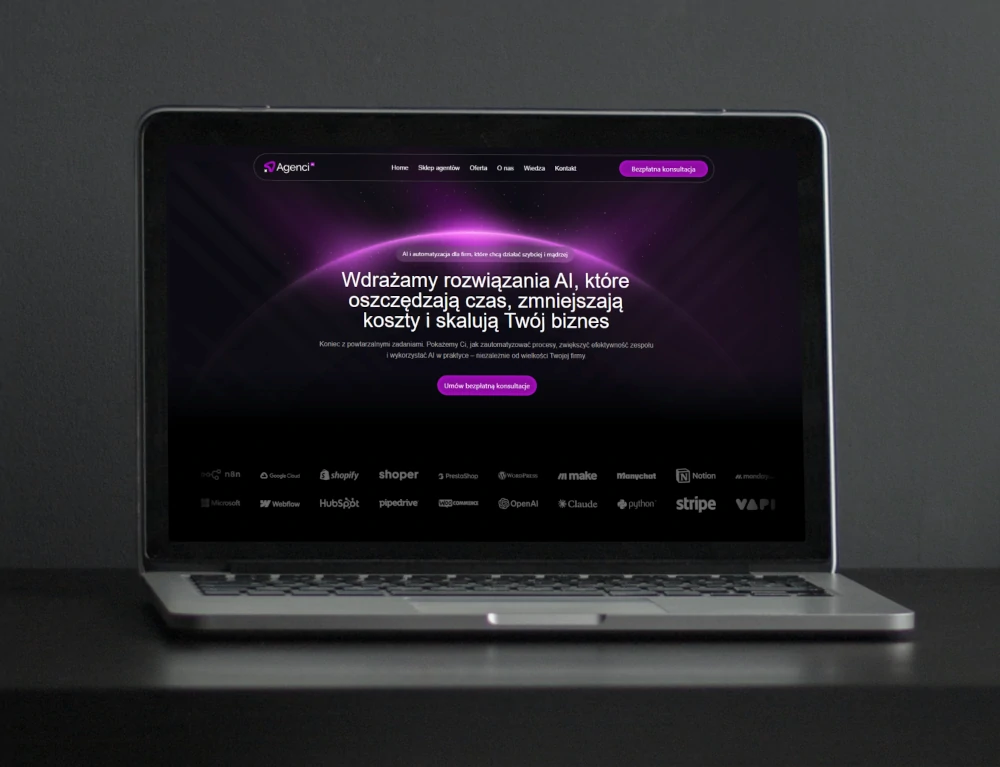 Poprzednia strona Agenci AI nie oddawała nowoczesnego charakteru marki i nie wspierała skutecznej prezentacji oferty. Brakowało spójnej narracji, wyraźnych wyróżników oraz wyraźnej ścieżki do kontaktu. Naszym celem było odświeżenie wizerunku, uporządkowanie treści i zaprojektowanie witryny, która buduje zaufanie oraz skutecznie generuje zapytania.